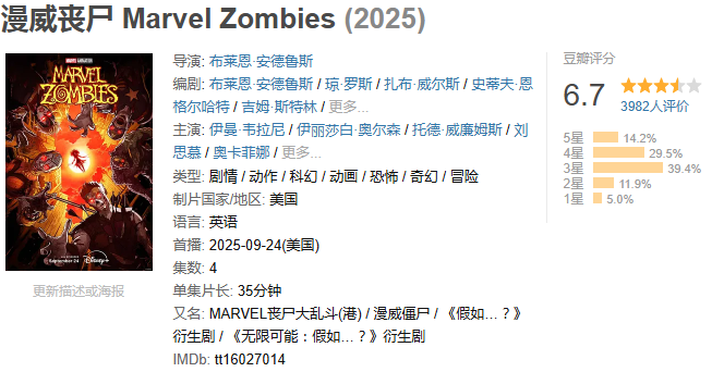 《漫威丧尸》于Disney+首播当日即一次性放出4集,创下平台动画剧集首日播放量纪录。